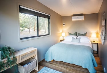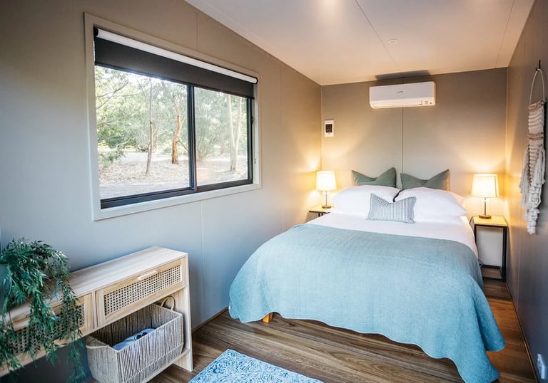 These modern two-bedroom expandable cabins feature a full glass front, bringing the outdoors in and filling your stay with natural light and scenic views.